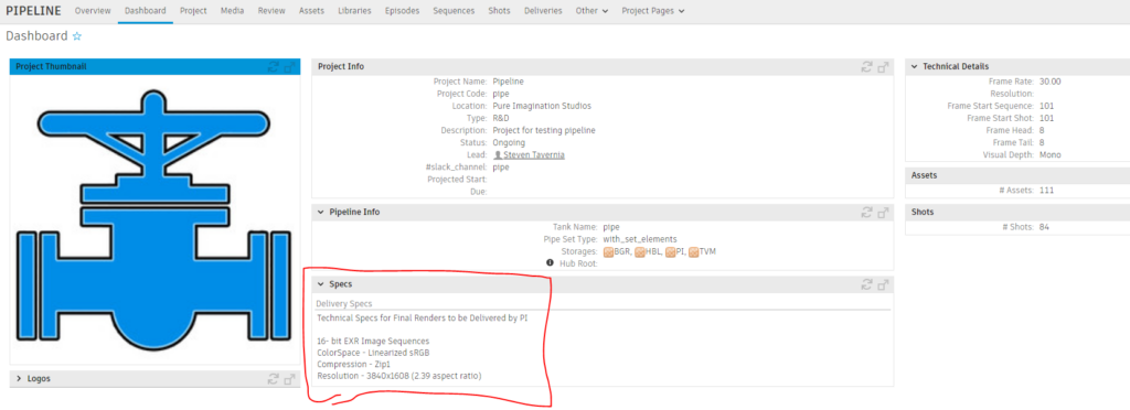 Delivery Specs field has been added to the Dashboard (Overview). This field is an open text box which should be used to store any and all delivery specs as specified by the project deliverables.